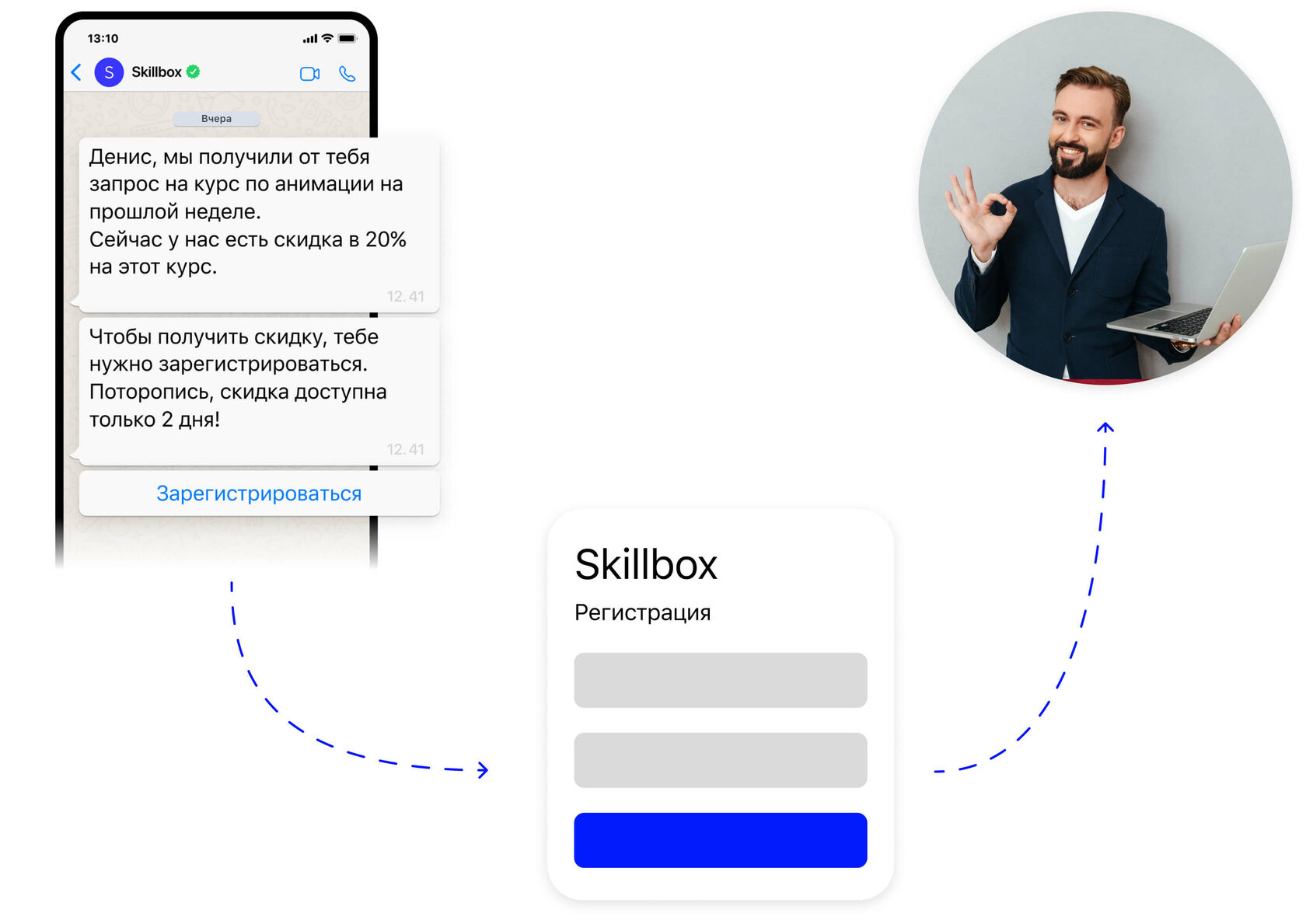 Делитесь подробностями о продуктах, услугах и курсах с потенциальными клиентами, повышайте интерес и количество конверсий с помощью интерактивных кнопок